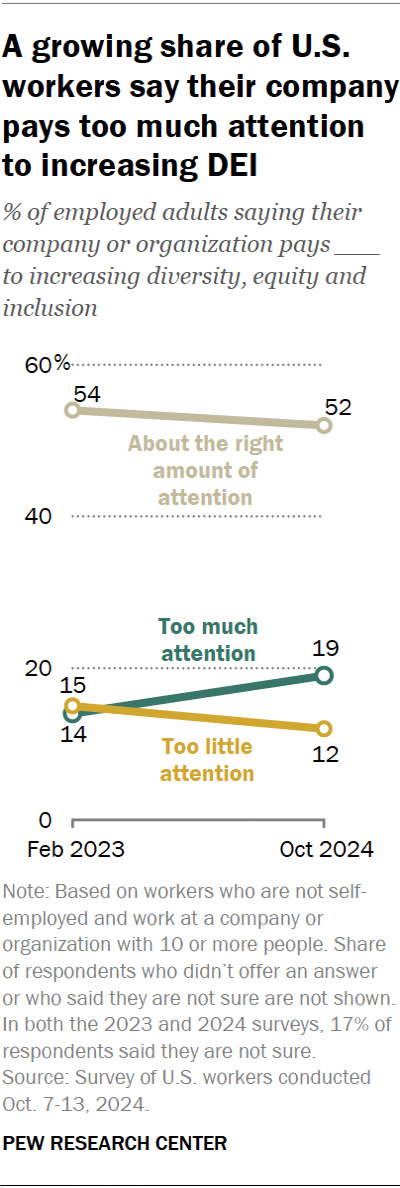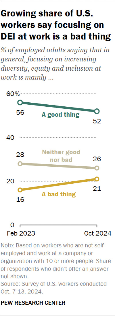And look, I know to some of you out there, DEI programs are basically the cream of the crop when it comes to worthwhile initiatives. I know you hate what President Trump, and the Republican party more broadly, are doing to DEI programs. That said, can I let you in on a secret? Most people don’t care about these programs one way or the other.3 Generally speaking DEI programs are meaningless to them. For employed adults that claim to care, the outlook is not positive for DEI, with trends indicating a growing share of workers say the focus on DEI at work is a bad thing and that their companies pay too much attention to DEI.